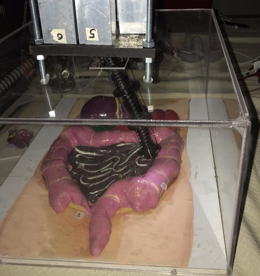 The system was tested in a simulated physical environment representing the abdominopelvic cavity. Inverse kinematics were implemented to relate the system variables using MATLAB and Arduino, while manipulation was achieved through a joystick interface and PID control.